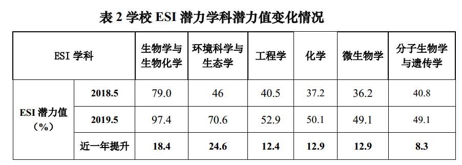 生物学与生物化学,环境科学与生态学两个ESI潜力学科学术提升显著,距ESI全球前1%的达成度有较大进展,较去年同期提升了18.4%和24.6%,其中生物学与生物化学的潜力值已高达97.4%。另外,工程学、化学、微生物学和分子生物学与遗传学4个ESI学科的潜力值也稳步提升。