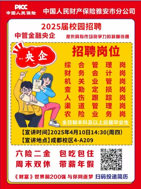 雅安市分公司宣讲会来啦~!4月10日下午,成都校区4-A209,职等你来!另有限量礼品,先到先得【中国人民财产保险股份有限公司】是亚洲第一、世界第三的非寿险公司✨央企✨