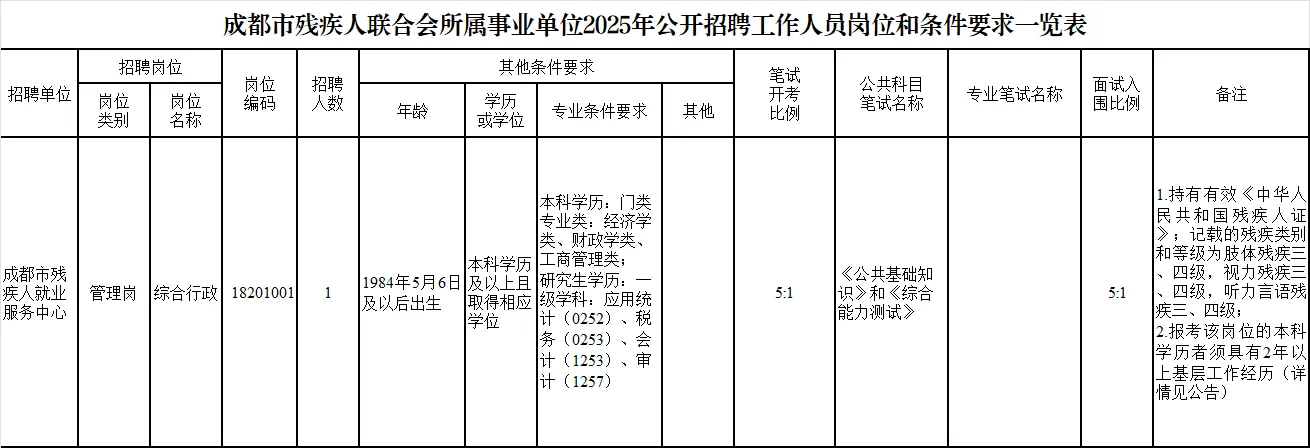 招聘岗位及名额:成都市残疾人联合会所属成都市残疾人就业服务中心面向社会公开招聘工作人员1名(面向残疾人公开招聘)。