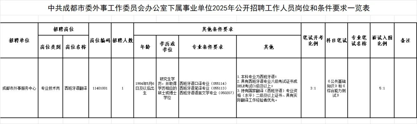 招聘岗位及名额:中共成都市委外事工作委员会办公室面向社会公开招聘工作人员1名。