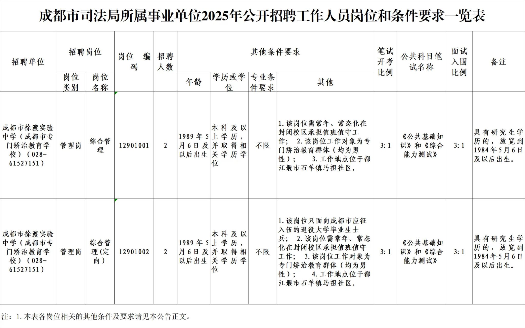 招聘岗位及名额:成都市司法局所属事业单位成都市徐渡实验中学面向社会公开招聘工作人员共4名。