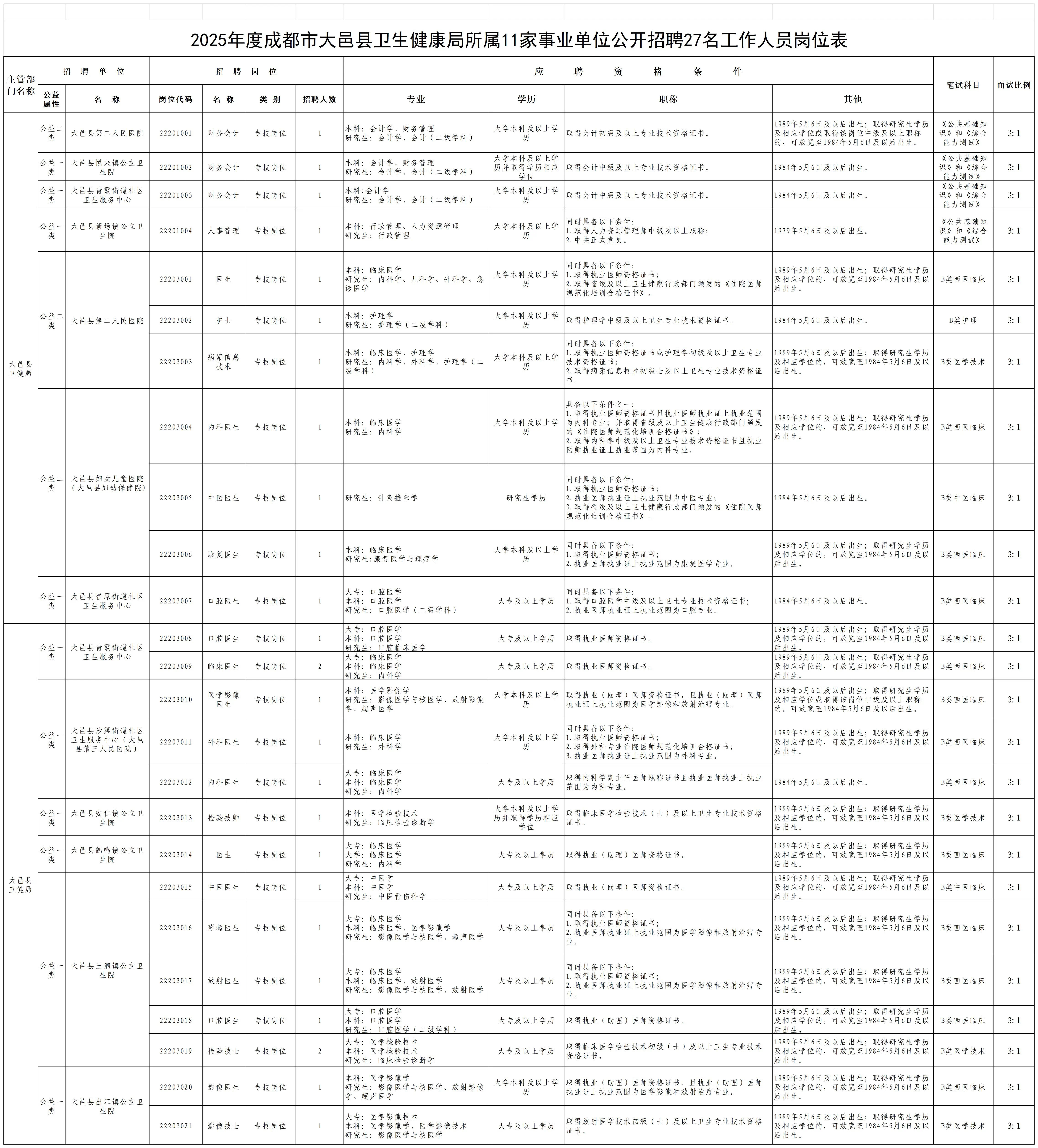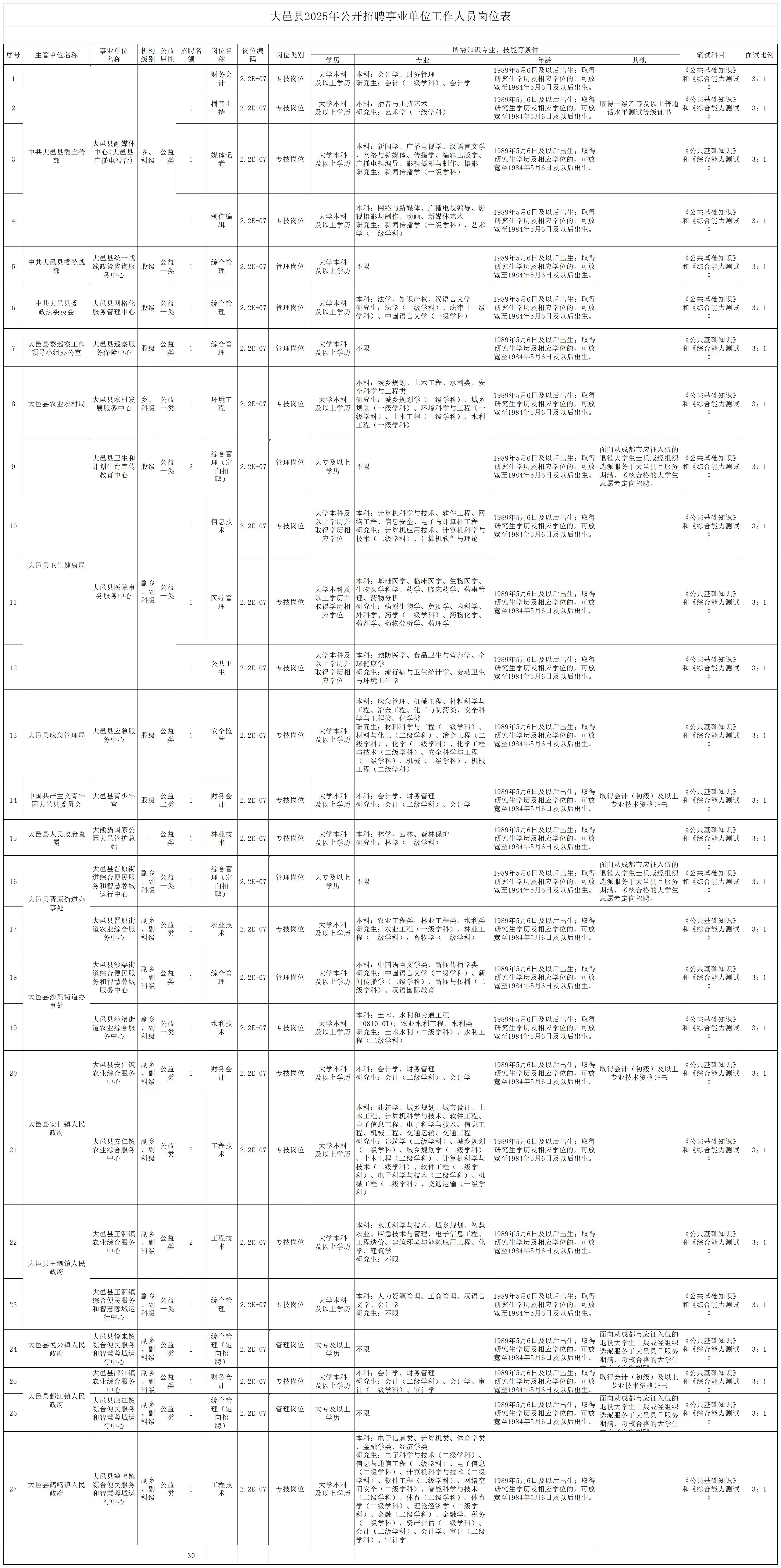 招聘岗位及名额:成都市大邑县将面向社会公开招聘事业单位工作人员30名;大邑县卫生健康局所属11家事业单位面向社会公开招聘工作人员共27名。