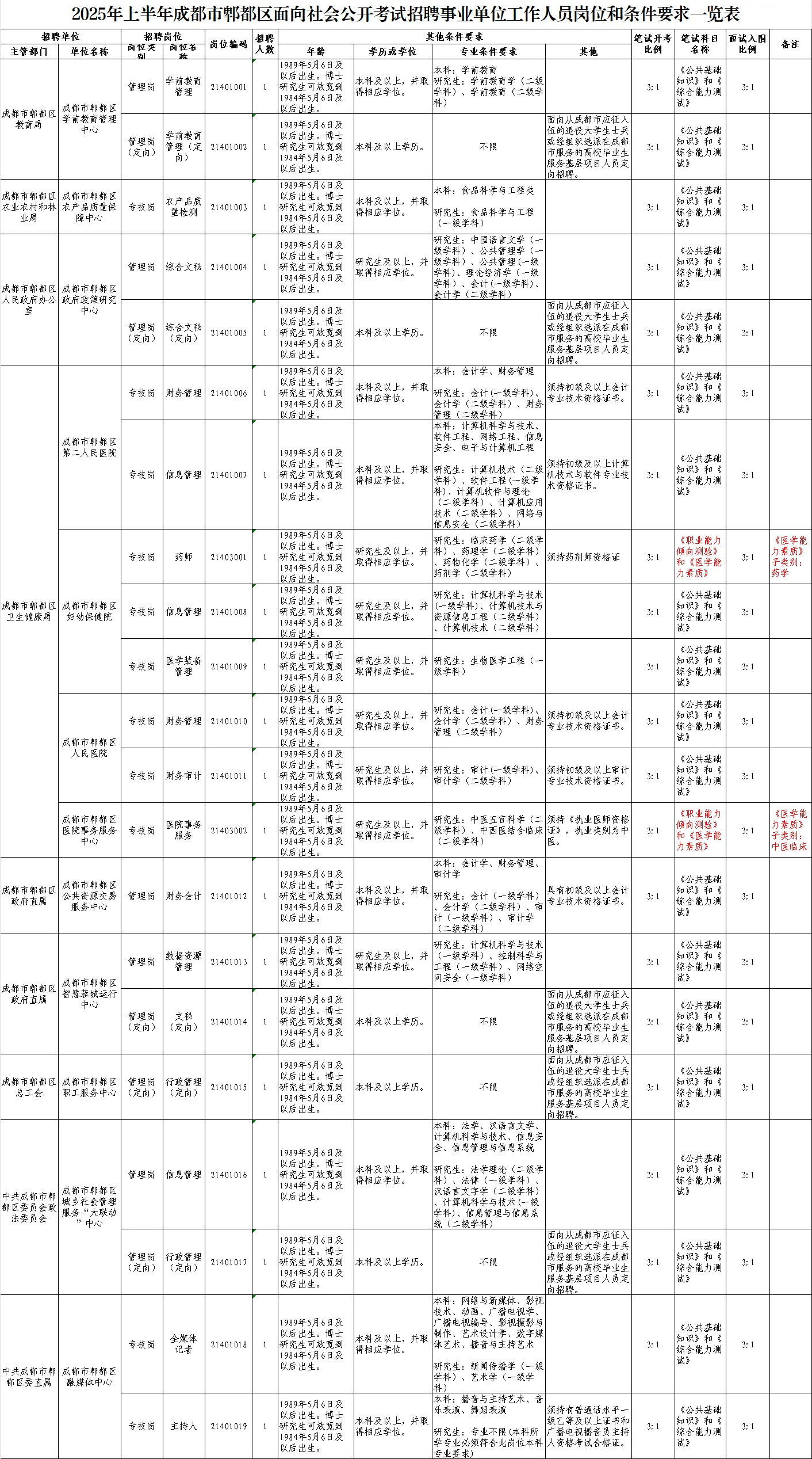 招聘岗位及名额:蒲江县现面向社会公开招聘事业单位工作人员14名;蒲江县医疗卫生事业单位现面向社会公开招聘事业单位工作人员23名。