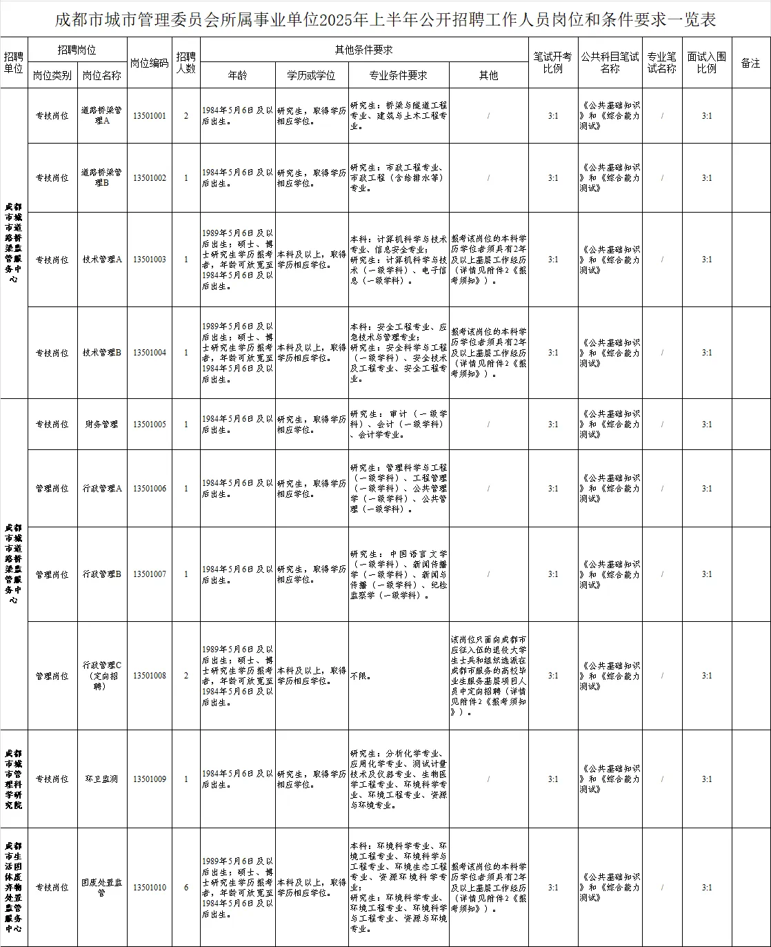 招聘岗位及名额:成都市城市管理委员会所属3家事业单位拟面向社会公开招聘工作人员17名。