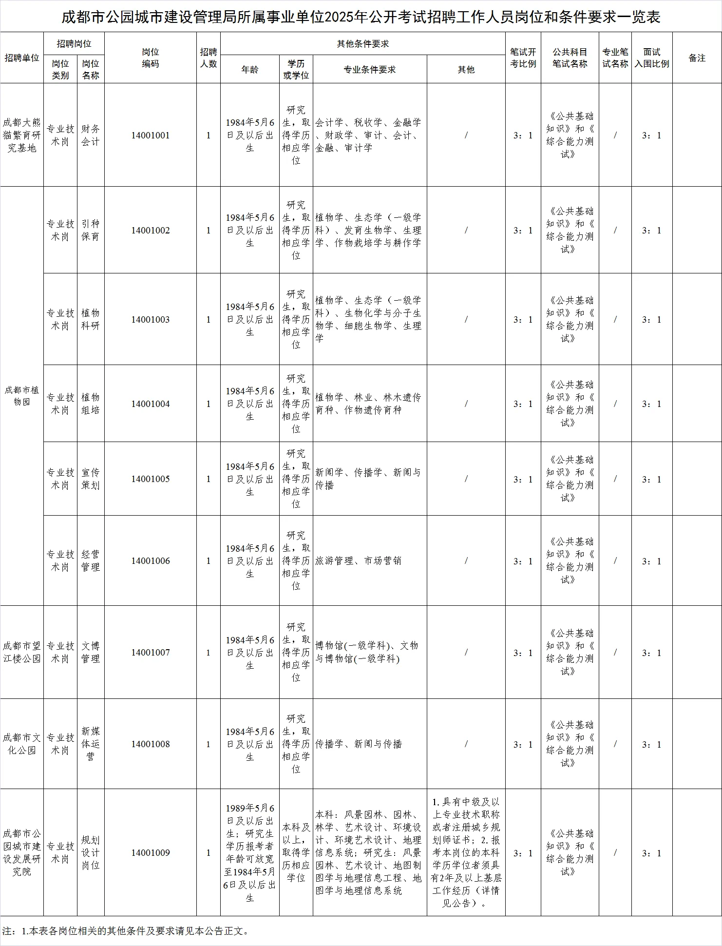 招聘岗位及名额:成都市公园城市建设管理局面向社会公开招聘工作人员9名。