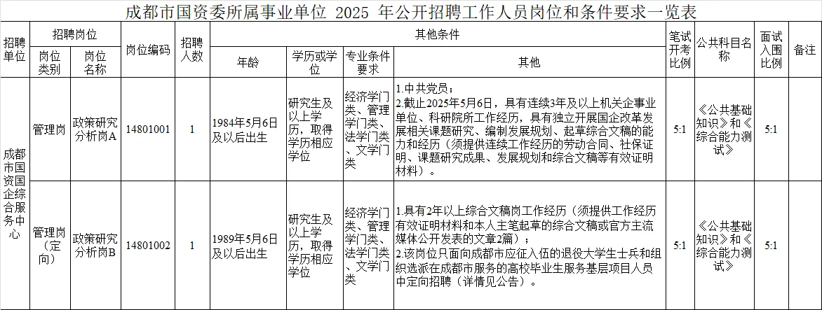 招聘岗位及名额:成都市国资委所属1家事业单位—成都市国资国企综合服务中心面向社会公开招聘2名工作人员。