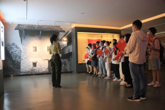 在纪念馆前的广场上,中国工农红军强渡大渡河纪念碑巍然矗立。碑体正面为半圆雕红军战士塑像,炯炯双眼凝视对岸;下半部则展现了十七勇士驾着当地特有的翘首木舟乘风破浪,飞渡天险的场景。纪念碑前,全体党员举起右拳,面向党旗,在支部书记竭志昊同学的带领下,重温入党誓词,庄严地许下“为共产主义奋斗终身,随时准备为党和人民牺牲一切,永不叛党”的承诺。