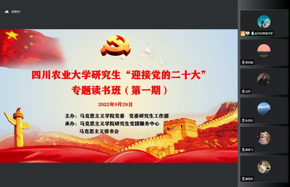 2022年9月28日下午,由马克思主义学院党委和党委研工部共同主办的ok138cn太阳集团529研究生“迎接党的二十大”专题读书班(第一期)于腾讯会议线上顺利开展。